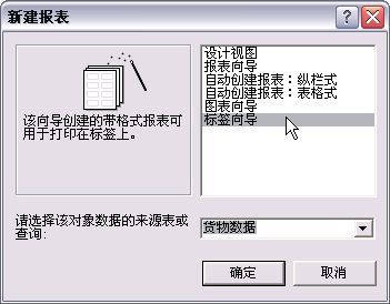 鼠标单击如图23中的“报表”,然后选中右窗格中的“使用向导创建报表”,单击“新建”按钮即可打开“新建报表”对话框(如图25)。选中其中的“标签向导”,然后打开下面的下拉列表找到刚才建立的“货物标签数据表”,单击“确定”按钮即可打开“标签向导”对话框。