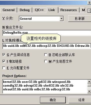 由于VC++默认的链接库中并不包含DirectX的库,因此在使用DirectDraw、DirectSound等接口时,会出现编译时链接错误,解决该问题必须添加链接。在VC++的LIB设置中添加“DXGUID.LIB”(所有DirectX程序均需使用)、“DDRAW.LIB”(DirectDRAW编译时必需)、“DirectSOUND.LIB”(DirectSOUND编译时必需)文件,且文件名用空格分隔(图2)。