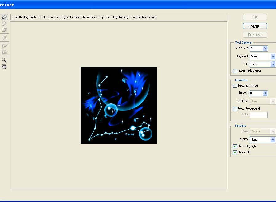 Extract(抽出)可以将对象与其背景分离,无论对象的边缘是多么细微和复杂,使用抽出命令都能够得到满意的效果。主要步骤为先标记出对象的边缘并对要保留的部分进行填充,可以进行预览,然后对抽出的效果进行修饰。如图14所示。
