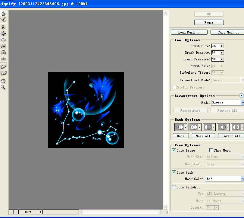 使用它Liquify(液化)滤镜所提供的工具,我们可以对图像任意扭曲,还可以定义扭曲的范围和强度。还可以将我们调整好的变形效果存储起来或载入以前存储的变形效果,总之,液化命令为我们在Photoshop中变形图像和创建特殊效果提供了强大的功能。如图15所示。