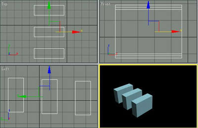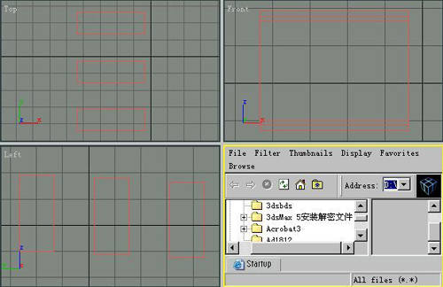 (1)首先启动3DS MAX6软件,将会出现如图24所示的视图区,视图区共分为四个窗口,即:Top(顶视图)、Front(前视图)、Left(左视图)、Perspective(透视图),这里是我们进行三维动画创作的主要空间。对于视图区的调整,我们可以使用屏幕菜单Customize/Viewport Configuration(自定义/视图设置)来完成,利用它我们可以设置自己喜欢的视图。