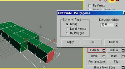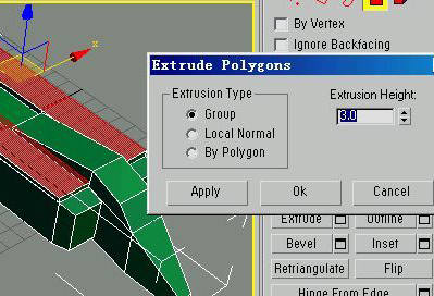 (12)在多边形的次物体级别中,选择如图所示的多边形,然后单击命令面板上的EXTRUDE项右侧的按钮,设置其EXTRUSION HIGHT的值为5,按下OK按钮,如图13所示。