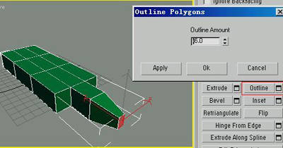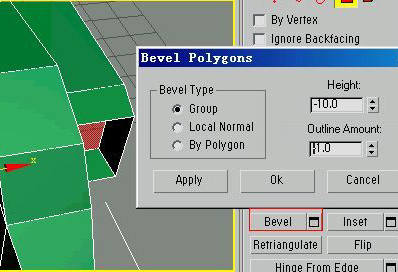(13)再次进入多边形层级中,选择如图所示的多边形,按下命令面板下的BEVEL按钮,在弹出的窗口中设置其HEIGHT为35,OUTLINE AMOUNT为-8,按下回车键,如图14所示。