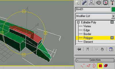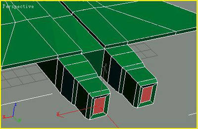 (6)在命令面板上再次进入多边形的次物体级别中,选择如图所示的多边形,然后单击命令面板上的EXTRUDE项右侧的按钮,设置其EXTRUSION HIGHT的值为10,如图7所示。