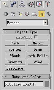 Dynamics(动力学):使用时要与建立命令面板中的支持动力学系统的空间扭曲物体配合使用,如Gravity(重力)、Wind(风力)、Push(推力)等等。