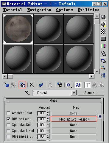 (2)在材质编辑器中,首先单击左上角的第一个材质球激活它,然后单击Maps按钮打开卷展栏,单击Diffuse Color右侧的Node按钮,在弹出的窗口中单击选择Bitmap项,然后在弹出的窗口中选择WALKER.jpg贴图文件,按下OK按钮。如图17所示。
