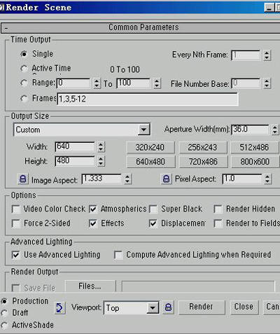 (1)在工具栏中单击Render Scene按钮,打开渲染输出对话框,如图23所示。