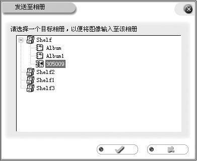 点击储藏柜,在缩略图窗口将出现列表模式。右击储藏柜或列表模式中的图标将弹出菜单:浏览、发送到相册、删除和属性。点击发送到相册将弹出对话框(如图4),我们点选所要发送到的相册,然后点击“钩”按钮即可。