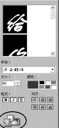 (6)在图中所示的窗口上边的空白处输入文字“给你永远的祝福”。在“字体”中点击黑色小三角形的下拉按扭,将出来众多的字体供你选择,我们选择“方正舒体”,“大小”为60,“格式”全选,“对齐”为左对齐。