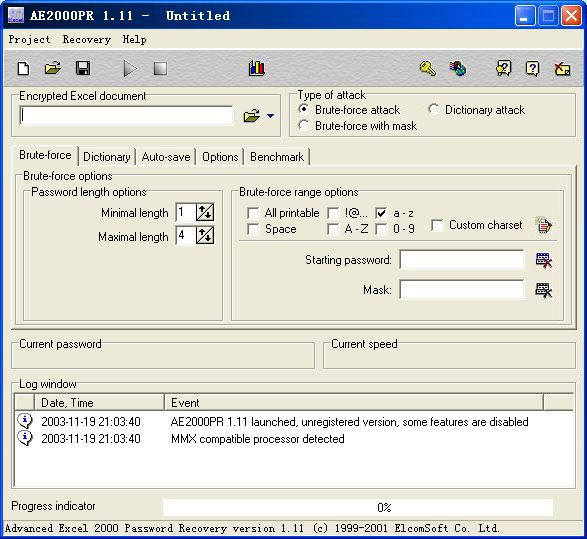 如果要解密Excel文件,我们可以使用ElcomSoft公司开发AE2000PR(Advanced Excel 2000 Password Recovery),你可以到http://www.elcomsoft.com/ae2000pr.html下载该软件。