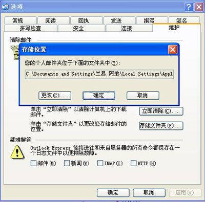 启动OE,新建一个账户,如NewTemp。选中NewTemp账户,单击“工具→选项”菜单命令,在出现的对话框中单击“维护”选项卡。单击“存储文件夹”按钮,在出现的对话框中,记住该对话框中所示的个人邮件夹的存储路径。如图6所示。