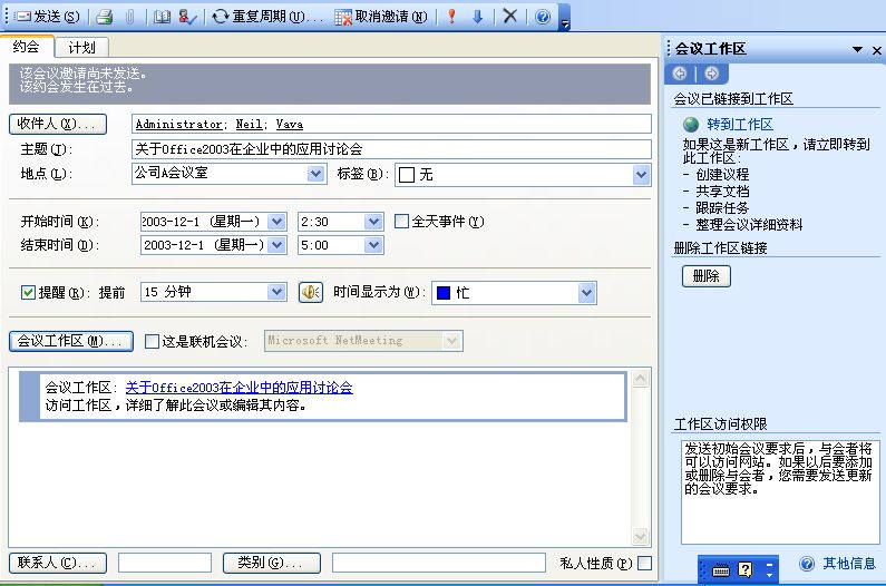 单击“发送”就可以将此会议邀请通过电子邮件的方式发送给会议相关者。