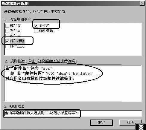 目前电脑病毒主要通过网络邮件进行传播,所以《金山毒霸6》在功能上除了保留了前作的闪电杀毒、快捷方式杀毒、屏保杀毒等查毒方式以外,新增的邮件规则编辑器大大提供了对邮件病毒的防护能力。在新的邮件规则编辑器中,可以对附件中所含文件类型进一步进行甄别(图2)。