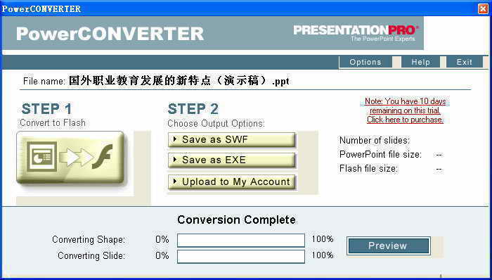 一个是PowerPoint文件,一个是Flash文件,这两者之间怎么能够互相转换呢?其实,我们只要借助一款名为PowerConverter的软件,就可以在极短时间内将PowerPoint生成的PPT格式文件快速转换为Flash格式的SWF文件;同时,还能够在转换的同时使之成为一种流媒体格式,这样可以直接将转换生成的SWF文件上传到网站上进行发布;或者直接生成EXE文件,这样就可以刻录到自动播放的多媒体光盘上去。
