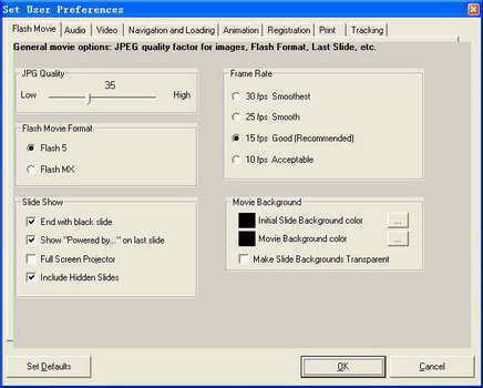 假如你希望能够对转换过程获取更高级别的控制权限,可以在图1窗口中点击“Options”按钮打开图2对话框,在这里可以设置JPEG质量、Flash文件的格式(Flash 5还是Flash MX)、帧数、背景色等,笔者就不多说了,朋友们可以慢慢研究。