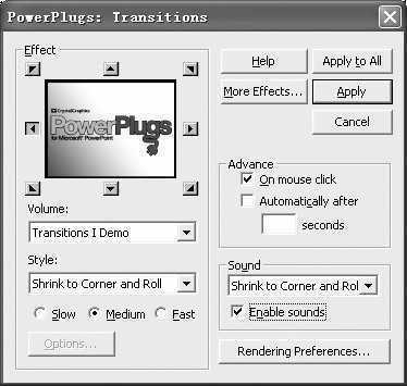 PowerPlugs:Transitions除了提供丰富的3D转场效果外,每个转场效果还附带了声音效果,当我们在“Style”项中选择了需要的3D转场效果后,在“Sound”项中程序会自动添加该效果的声音。当然我们还可以在单击“Sound”项中的下拉菜单里选择其他的声音。如果我们不想使用声音文件,只要去掉“Enable Sounds”项中的“√”即可。