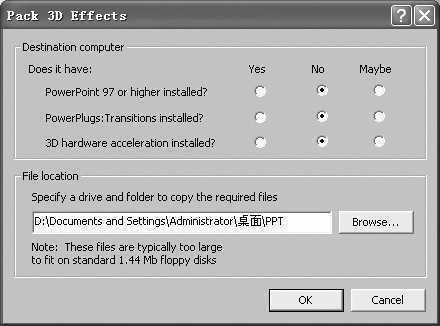 整个演示文稿修改后,我们还可以通过PowerPlugs:Transitions程序给演示文稿打包,单击Transitions工具栏中的“Pack 3D Effect”,随后弹出一个“Pack 3D Effect”对话框(图3),为了确保打包文件能在其他计算机上播放,将该对话框中的三个选项都选择为“no”,并在下面的“File Location”文本框中输入打包文件保存的路径,随后单击“OK”按钮即可。