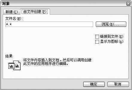 歌曲准备好后,我们就可以开始打开歌曲菜单了。打开Word 2003,并新建一个文档,将光标放在欲播放歌曲的位置,然后单击菜单“插入→对象…”,打开“对象”窗口,并在此窗口中选择“由文件创建”标签(图1)。
