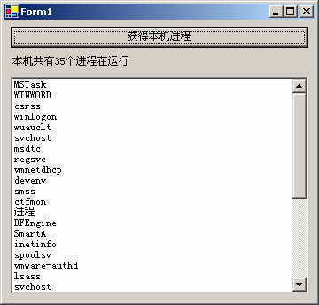 首先建立一个窗口,在窗口上添加Button1、Listbox1、Label1三个控件。将所有的Listbox控件的HorizontalScrollbar属性设置为true。Button1的text属性为“获得本机进程”,其余控件保持默认属性。