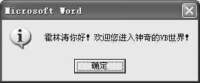 第三步:输入完毕后,单击工具栏上的“运行子过程”按钮(或按下“F5”键),在屏幕的中心位置,会出现一个空白的窗体,在该窗体上双击鼠标左键,就会弹出一个输入窗口,默认用户名是“无名氏”,输入你的姓名后,单击“确定”按钮,最后出现一个对话框,如图2,很不错吧!