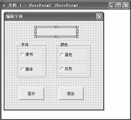 第三步:双击“退出”按钮,在代码窗口中输入“End”即可。按下“F5”这个快捷键,运行该程序,选中字体为“隶书”,颜色为“蓝色”,然后单击“显示”按钮,效果如图5所示。