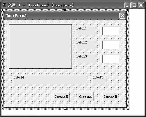第一步:在Word的Visual Basic编辑器中,选择“插入→用户窗体”,新建一个窗体,将鼠标指针移到窗体四周的某个尺寸柄上,然后拖动鼠标调整窗体至适当大小,在窗体中加入一个“图像”控件,五个“标签”控件,三个“文本框”控件和三个“命令按钮”,调整好各个控件的位置和大小,程序界面如图6所示。