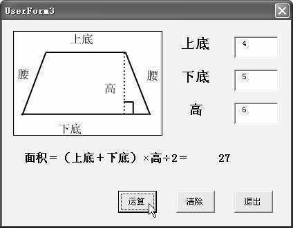 最后用鼠标双击“退出”按钮,输入“End”即可,按“F5”键运行该程序,输入相应的数值后,用鼠标单击“运算”按钮,立刻会求出梯形的面积,单击“清除”按钮可进行下一次运算。如图8所示。