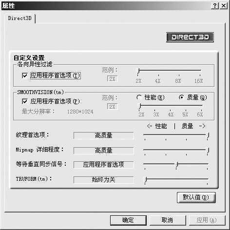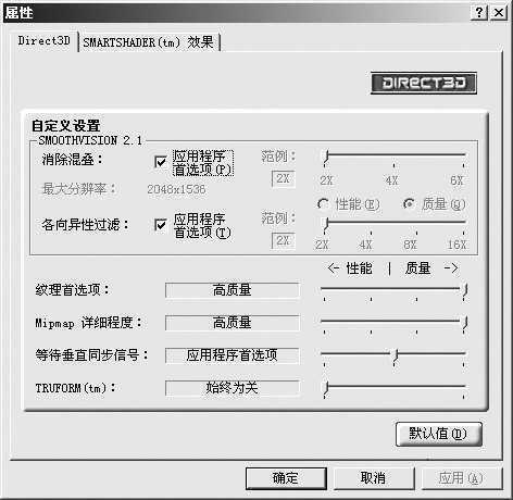 点选“使用自定义设置”再点“自定义按钮”就切换到自定义页面。从Radeon8500开始ATi就使用SmoothVision来命名自己的画质优化技术,到Radeon9800XT,它已经发展到了2.1版。包括了全屏抗锯齿(就是驱动中命名的“消除混叠”)和各向异性过滤两个主要方面。在ATi驱动的具体设置中,如果我们勾选了“应用程序首选项”,就意味着要将全屏抗锯齿和各向异性过滤的级别设置交给3D程序来处理,同时也已经将驱动中的全屏抗锯齿和各向异性过滤功能加以关闭。如果我们取消,就可在驱动中自由设定两者的级别。