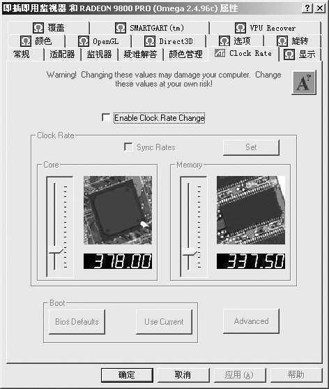 这个驱动中增加了官方驱动所没有的超频选项,其实它是靠集成一个第三方软件Rad Clocker实现的。先勾选“Enable Clock Rate Change”允许超频,我们可以直接在表示核心和显存的图片边拖动频率滑杆进行超频,这也是提高显卡性能最立竿见影的办法之一。只是注意不要一次超得太多,要几赫兹、几赫兹慢慢向上超。勾选“Sync Rate”可以让核心和显存频率一致,不过这没有多大意义。点击“Advance”可以设定超频最高上限。超到合适频率后使用“SET”按钮就可以使频率生效。在Boot启动中,选择“BIOS Defaults”下次重启后将按照BIOS中的频率设定恢复显卡频率;选择 “Use Current”用户当前设定,重启后将按用户的超频频率工作。