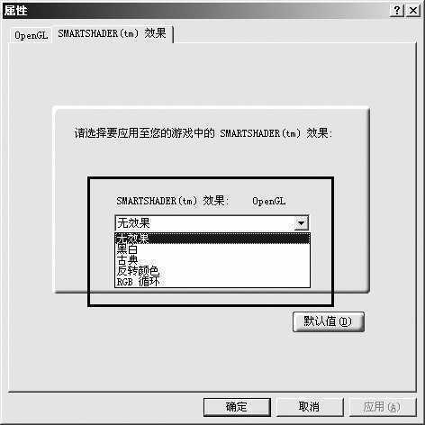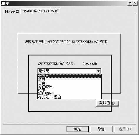 SMARTSHADER特效:这也是催化剂3.8中开始新加入的好玩东西。ATi把自己的渲染技术统称为SMARTSHADER,它利用了DX9的像素渲染特性,可以对渲染之后的显示帧缓存进行着色,为游戏添加有趣的效果。D3D下一共有黑白、古典、反转颜色等6种效果,特效各异,别有一番风味。而且开启这些特效对于游戏速度的影响并不大,大家都可以来试一试。不过特效的数量是随着显卡等级的降低而减少的。到Radeon 9200以下的显卡在D3D下就没有SMARTSHADER特效了。