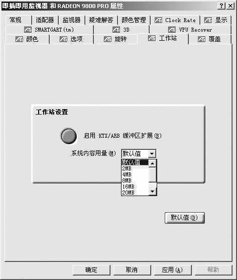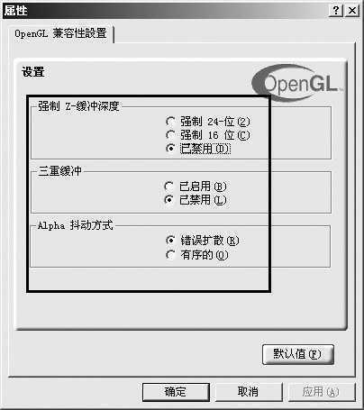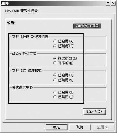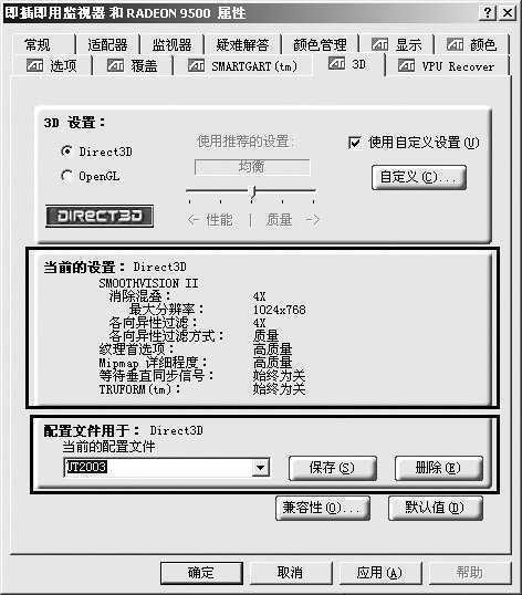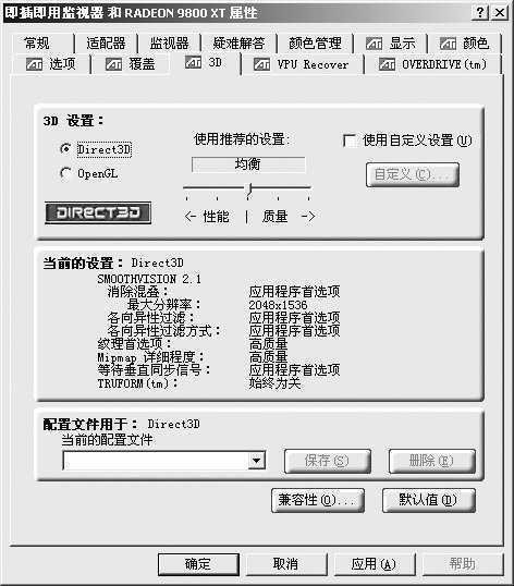 兼容性设定:在3D选项页面中还有一个不太引人注意的兼容性设定。在它的里面会根据显卡的不同有不同兼容性设定。Radeon 9200这一级别显卡的选项反而比Radeon 9800XT要多,看来核心的改进的确提高了兼容性。“支持32位Z-缓冲深度”在3D环境中每个像素都会用一组数据来定义显示时的纵深,从而正确显示物体的前后位置。高级显卡可以支持到32位的Z-缓冲深度,在复杂场景中有助于避免画面闪烁现象的发生。但它会降低游戏一些速度,所以低档卡还是默认关闭为好。而高档卡如Radeon 9800XT已经取消了这个选项,直接默认打开。还有一种我们截图上没有的“支持W缓冲”兼容设置,在游戏出现远景剪切交错的错误时,可以用它来代替Z-缓冲,但代价也是降低游戏速度。