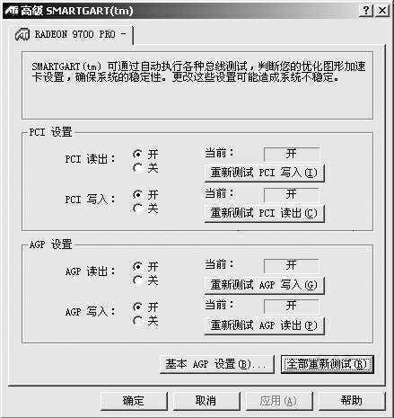 在催化剂驱动中,ATi也内置了SMARTGART技术,可以自动检测系统AGP、PCI总线,并给出最佳设置。在这里还可以设置打开或关闭AGP快写,如果打开后不出现问题,我们推荐打开。在每次更改SMARTGART设置之后,下次重新启动时,SMARTGART会自动进行检测,如果出现不稳定状况,SMARTGART就会忽略这次更改。如果要查找问题所在,就要用到高级SMARTGART模式。它并未在控制面板中列出,而是以快捷方式的形式隐藏在C:\Program Files\ATi Technologies\ATi Control Panel目录下。这里用户可以对PCI、AGP对系统内存的读取进行单项测试和全部测试,也可以单项禁止或允许PCI、AGP对系统内存进行读取。有助于查找问题的具体所在。