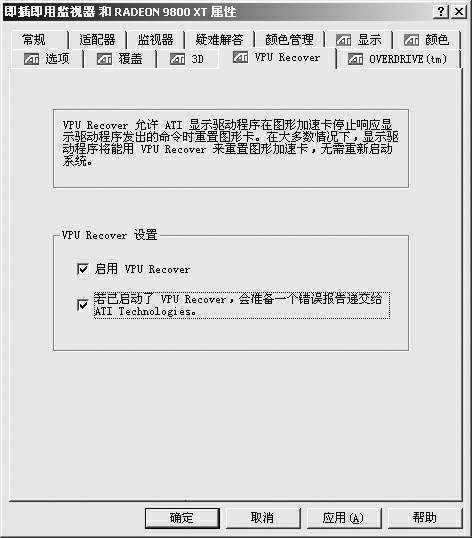 再看VPU Recover,这是一个新增的恢复选项。我们知道在显示驱动与显卡相互作用过程中,会由于各种因素导致计算机停止响应。一般情况下只有通过重新启动来恢复系统运行,但这样会导致众多未保存数据丢失(如尚未保存的文字稿件)。如果显卡具有VPU Recover这样的显示芯片重置功能,在驱动和硬件出现停止响应时,可以重新独立启动图形处理器,这样就可以避免电脑彻底死机,并阻止大部分应用程序被迫关闭。这就意味着用户的工作可以正常进行,避免了数据的大量丢失。此外我们还可以打开下面的“提交错误报告给ATi”,当出现错误时,它会收集驱动的详细信息,并和硬件配置加以对比。然后会打开邮件系统以加密的方式给ATi发送错误报告,这对ATi完善驱动开发有很大的积极作用。当然如果担心个人隐私会被泄露,我们也可以关掉这个错误报告,但VPU Recover是一定要打开的。