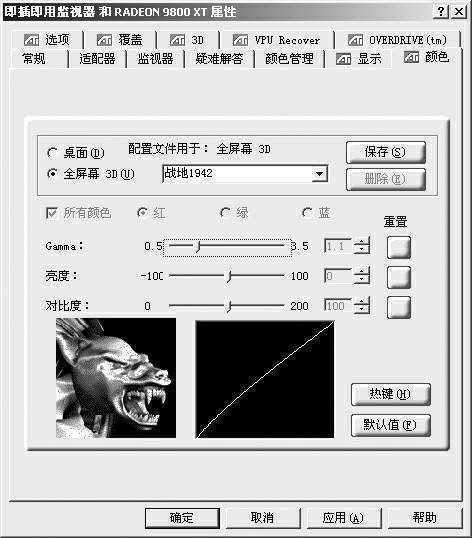 颜色选项,ATi的显示画面一向以颜色亮丽、丰富著称,无论这是不是调高Gamma的结果,ATi在画面显示方面下的功夫都是不能否认的。而且从催化剂3.4开始,用户已经可以分别对桌面和3D程序单独进行Gamma、亮度、对比度调节,并将设置保存下来。