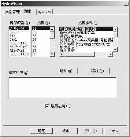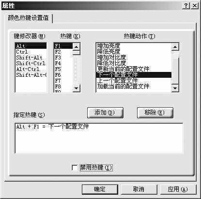 这里我们要讲一讲它的热键切换功能,当我们分别设置好数个游戏显示配置后,可以点击“热键”进入配置界面,选中热键动作“下一配置文件”,再分别选用“键修改器”和“热键”各一个,再点“添加”,下方“指定热键”中就会出现配置好的热键动作。这样我们可以直接使用热键切换不同游戏显示配置而减少进入控制面板的麻烦。