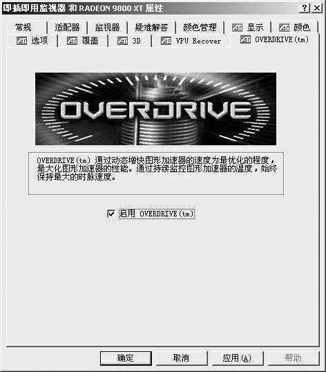 不过由于ATi无法也不能限制显卡厂商自行设置PCB板,自行采购显存,所以这种超频技术也只能用在核心超频上,而对显存的超频无能为力,这也算是无奈的遗憾吧。至于使用方法就很简单,只要是Radeon9600XT、Radeon9800XT显卡,勾选上“启用OVERDRIVER”即可。如果不是上述两种显卡这个选项是不会出现的。