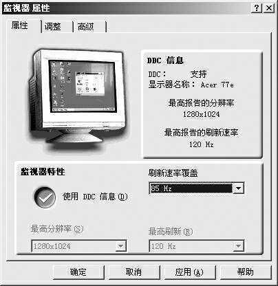 “显示”选项,它会自动侦测显卡所连接的显示设备,是CRT、LCD、电视还是其他?它和Windows的“显示属性”相配合也有初步的双头显示配置功能。每接上一个显示设备,都会以彩色图表表示出来,点击图标上方的“监视器”按钮就可以进入调节面板。首先就是DDC信息页。在DDC界面中,我们可以使用“刷新过率覆盖”强制使用一个刷新率,也可以取消DDC按钮的选择,自定义最高分辨率和最高刷新率。不过除了要超频显示器,一般情况不要轻易改变这里的设置以免损坏显示器。调整页面则可以部分代替显示器自身的左右、上下和屏幕大小调整。