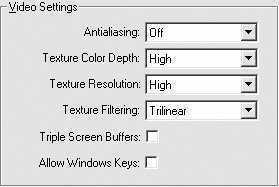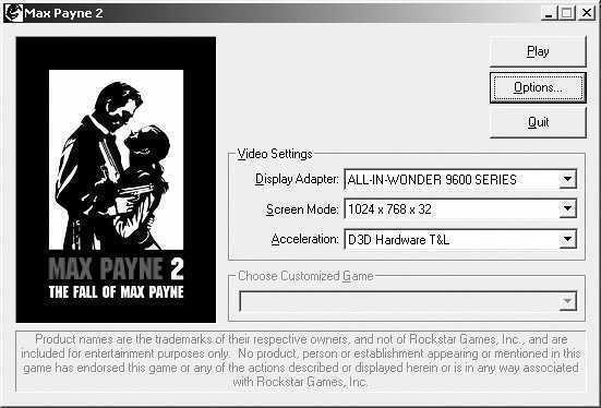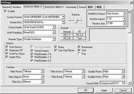 在第一页面中,仅仅是简单的显卡选择(一般都是自动侦测出的)、分辨率色深设定和软硬件加速选择。到了Option页面就出现了比较专业的显示设定。Antialiasing(抗锯齿设定),有2倍、4倍、6倍三种选择,对于《Max Payne2》这种复杂的3D游戏,Radeon 9500以上可以试试2倍抗锯齿,Radeon 9200及其以下就不要开这个东西了。Texture Color Depth(纹理色深),Radeon 9500及其以上可以设为High,Radeon 9200及其以下设为Medium(中等)。Texture Resolution,如果有64MB显存和256MB系统内存可以设定为高。Texture Filtering(纹理过滤),同样有各向异性过滤、三线过滤和双线过滤。这里的各向异性过滤是配合三线过滤和双线过滤同时运行的。Radeon 9500以上可以使用各向异性过滤,Radeon 9200及其以下可以使用三线过滤或双线过滤。Triple Screen Buffers(三重缓冲),我们前面讲过,勾选上它可以在打开垂直同步时轻微提高速度,但可能会碰到兼容性问题,所以不推荐打开。