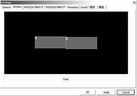上一次我们在NV篇中讲述了如何实现《古墓丽影6》的双头显示,现在我们给大家讲述更精彩的ATi的古墓丽影双头显示。首先要确定已经安装了ATi的双头显示软件,接着我们打开古墓丽影显示设置。要将两块9800XT显卡的设置都设为“Enable”(在双头显示下,会有两块显卡设置),否则无法实现双头显示。接着在Monitors中,将两个显示图标拖为平行状态,如图5所示。