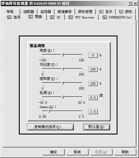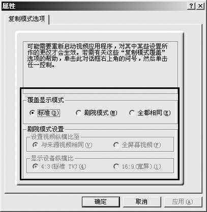 覆盖选项是用来调节视频回放的亮度、对比度、Gamma、饱和度的。这个选项有点古怪,在多数时候它是处于灰色不可选状态,只有用户先打开视频文件进行播放,然后再进入“覆盖”选项才可以进行调节。这里的调节不要一味只改动一个选项,比如针对画面暗淡的问题进行调节,就要以调节亮度为主,其他各项综合调节才能取得满意的结果。“复制模式选项”仅仅在双屏显示的克隆模式下才能使用。在其控制页中可以设定“覆盖显示模式”,它分为三种: