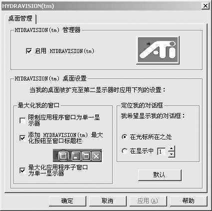ATi的双头显示控制软件目前分为HydraVision 3.21完全版和HydraVision Basic Edition 3.25基础版两种,都是需要单独安装的。基础版的版本号要高一些,是WinXP的界面风格。但如果先安装基础版,再安装完全版,完全版会将基础版覆盖掉。基础版主要是设定当用户桌面被扩展到第二桌面时应用哪些设置。“最大化应用程序子窗口为单一显示器”可以避免使用双屏时打开类似IE之类的浏览窗口后,文字内容正好处于两个显示器交接的中央的不便。“限制应用程序窗口为单一显示器”在使用非双头游戏时比较有用。“定位对画框于光标之处”更是避免了两个屏幕找鼠标的尴尬。