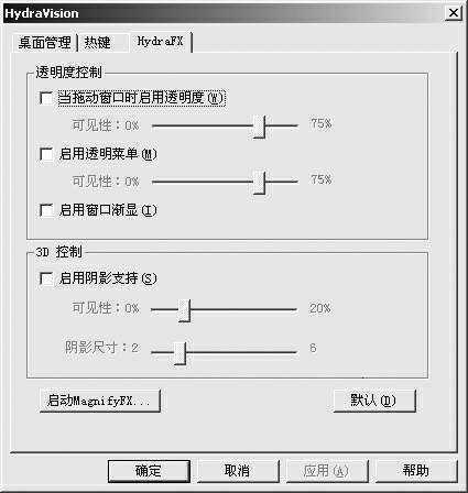 完全版的HydraVision设置就多了很多。不仅包括基础版中的所有内容还扩展了自动记忆程序位置、9个虚拟桌面、快捷键控制等内容。快捷键的设定和前面讲到的颜色配置快捷设定一模一样,只不过控制的内容改为切换应用程序、查找光标……还有一个HydraFX选项,是桌面显示特效控制,包括透明窗口、窗口渐变、透明支持。好玩倒是好玩,但实际意义不大。最有用的要数完全版默认支持的9个虚拟桌面,工作中有很多人桌面上堆满了大堆图标,其实完全可以将它们分类放在不同的虚拟桌面上,既方便又整洁。还可以使用鼠标滚轮切换。我们还发现类似于QQ这样的聊天窗口不受桌面切换的影响,总是在最上方,处于可以随时使用的状态。完全版还包括一个设置向导,以上所说的所有设置都可以在向导中一步步完成,非常方便。