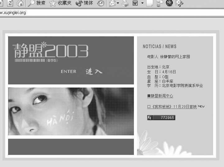 曾经在央视“艺术人生”里,看到徐静蕾用画笔勾勒自己的未来。她画了一级级台阶和一轮太阳,意为一步一个台阶地往上走。她确实这样做了──这个不起眼的邻家女孩今年捧走了中国电影三项大奖中的四个奖项!还有更多的资料,在“静盟”(http://www.xujinglei.org)里!