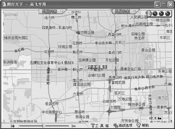 在地图窗口下方的“工具箱”中,还提供了很多实用的功能,包括公交车和出租车起点终点路线查询、绘图、打印等功能。例如,要查询从中央电视台到西单文化广场的行车路线,我们可以先在工具箱中选择“起点”图标,在地图上的中央电视台处点击一下,再选择“终点”图标,在地图上的西单文化广场处点击一下,这样,地图会自动显示出详细的行车路线。最后,我们还可以通过打印功能将这张地图打印出来,以便随身携带、随时查阅。