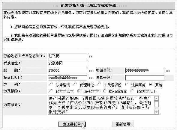 在这里你还可以使用网站的“在线委托”功能,进入“客户在线服务”页面后,点击“在线委托”就可以填写在线委托单了(见图),填妥相关个人资料及委托内容后按下“发送委托单”即可。