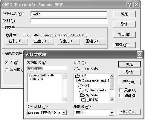 在“ODBC Microsoft Access安装”中,单击“选择”,然后找到刚才建立的“user.mdb”,在“数据源名”中写入“login”并确定(图3)。回到“Data Source Name(DSN)”中,在“Data Source Name(DSN)”下拉框中选择“login”,在“Connection Name”中输入“login”,单击“OK”。