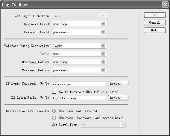 为了检查登录者是否为合法用户,打开“Window→Server Behaviors”面板,单击“+”按钮,选择“User Authentication→Log In User”命令,打开“Log In User”对话框,参照图4进行设置。