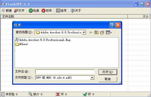 运行压缩包中的FlashSFV程序文件,查看其工具栏。首先,点击“打开”按钮,在弹出对话框中选择打开指定目录中的*.sfv文件(图1)。然后,大家在FlashSFV主界面中,点击“检查”按钮,程序将自动执行校验操作。大家查看如图2所示界面,在该界面下端会实时显示出单一校验文件进度与总进度,以及速率和剩余时间。校验完毕后,将在程序状态上看到结果,即是否有坏文件。