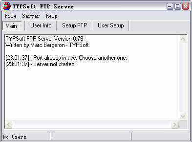 如果TYP默认设置的端口21被占用,表现状态如图1所示,列表中会显示“Port already in use.Choose another one”,结果是服务器无法启动,此时我们要手工重新设置TYP的端口,方法是选中图1所示窗口中的“Setup FTP”标签,然后在“FTP Port”后面的框中输入新端口号,再单击下面的“Save”按钮即可。