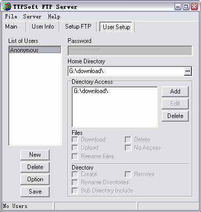 选择主窗口中的“User Setup”标签,然后选择匿名账户“Anonymous”,在右侧窗口中将“Home Directory”(主目录)设为我们欲共享的目录,在下面的“Directory Access”区中设置共享目录中子目录的用户访问权限(下载、上传、更改、删除等),上述选项设置好后按“Save”按钮保存即可(如图2所示)。
